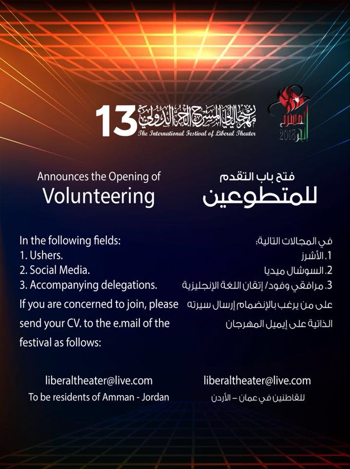 Vous cherchez un stage dans la culture à l'étranger ? Le Festival International du Théâtre Libre de Amman cherche des volontaires, bénévoles pour sa prochaine édition. Envoyez-nous vos candidatures et nous vous mettrons dans nos bagages pour effectuer votre stage à nos côtés, ou sous la direction de l'organisation du Festival.